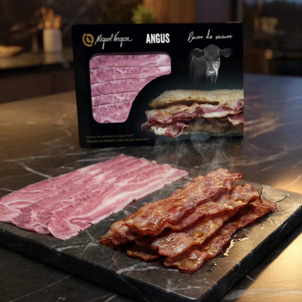 Pokud chceš slaninu, která chutná prémiově, tahle je ona. Bacon de Angus od Miguel Vergara je hovězí slanina z Black Angus krájená na tenké plátky, které se na pánvi rychle zatáhnou, pustí vůni a udělají přesně ten efekt, který chceš: šťavnatost a pak křupavý okraj.