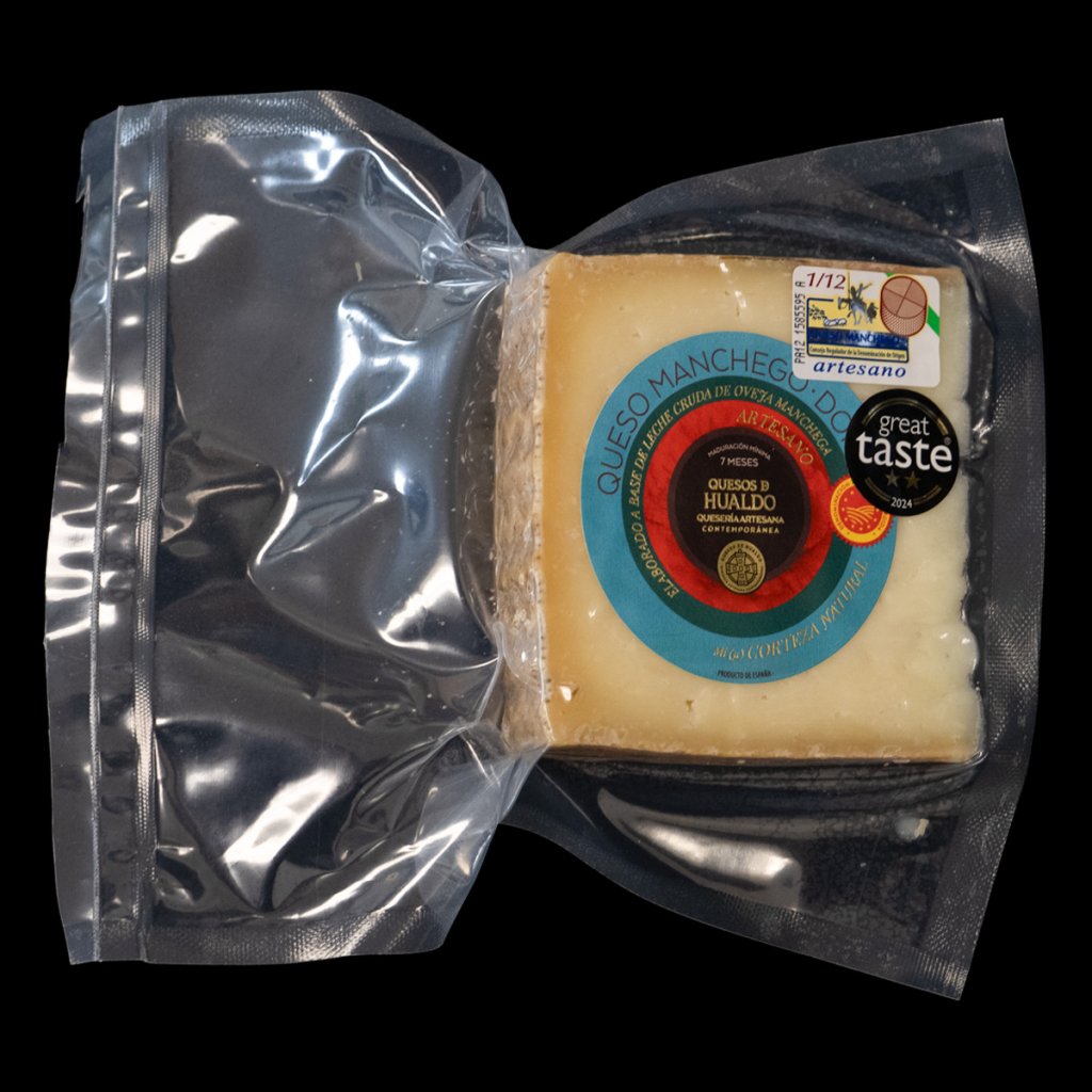 Manchego s chráněným označením původu (D.O.P.) od Hualdo, zralé 10 měsíců. Typický „cincho“ vzor na kůře vzniká tvarováním ve formě, během zrání se sýr pravidelně otáčí a kartáčuje.